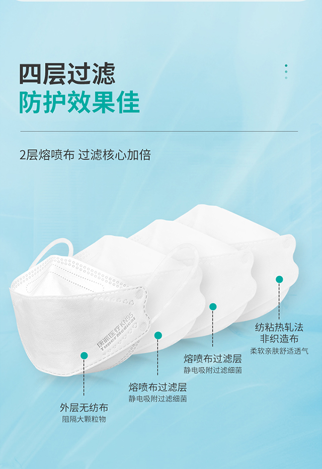 秝客KN95口罩,四層防護(hù),獨(dú)立包裝;4D立體設(shè)計(jì),貼合不勒耳;雙層熔噴布,金屬塑型條