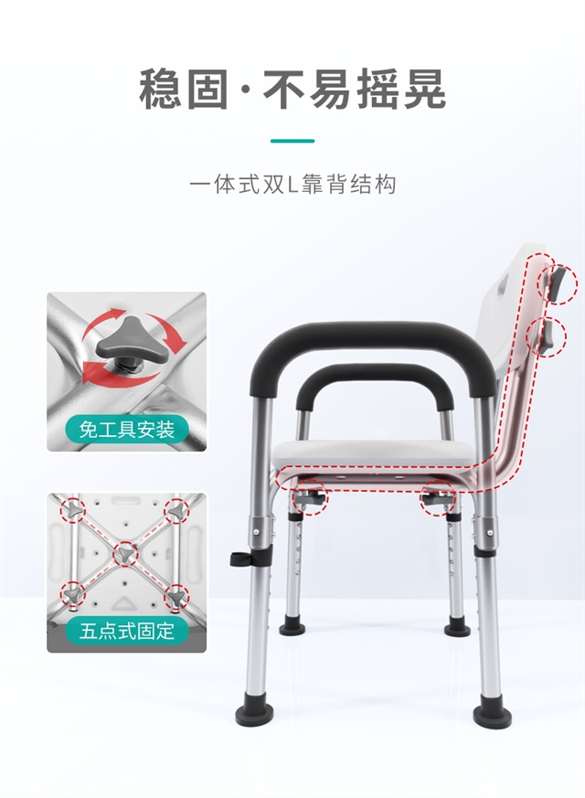 秝客洗澡椅扶手靠背款,醫(yī)療器械備案,使用更安心;五檔高度輕松調(diào)節(jié),防滑座椅,帶漏水孔設(shè)計(jì),適用于老人、孕婦等行動(dòng)不便人群